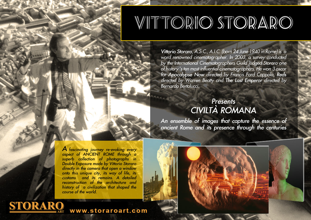 The website is dedicated to promoting Storaro's "Civilta' Romana" collection, which captures the essence of Roman civilization through a meticulous project that spanned Italy, Syria, Turkey, Greece, and other Roman Empire countries.